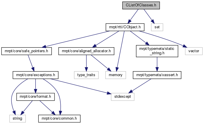 | A list (actually based on a std::set) of MRPT classes, capable of keeping any class registered by the mechanism of CObject classes. More... | |